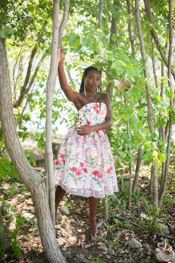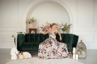 Tea length wedding dress with faux feather skirt and balconette bodice. Handcut and appliquéd florals adorning the corset bodice.